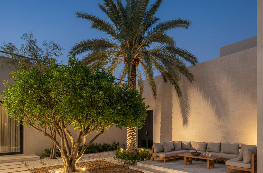 الإضاءة الليلية: تم توجيه إضاءة دافئة (Warm Light) من أسفل أشجار السدر والنخيل، مما خلق ظلالاً درامية ساحرة في المساء، تحول الحديقة إلى لوحة فنية دون الحاجة لزراعة زهور معقدة.